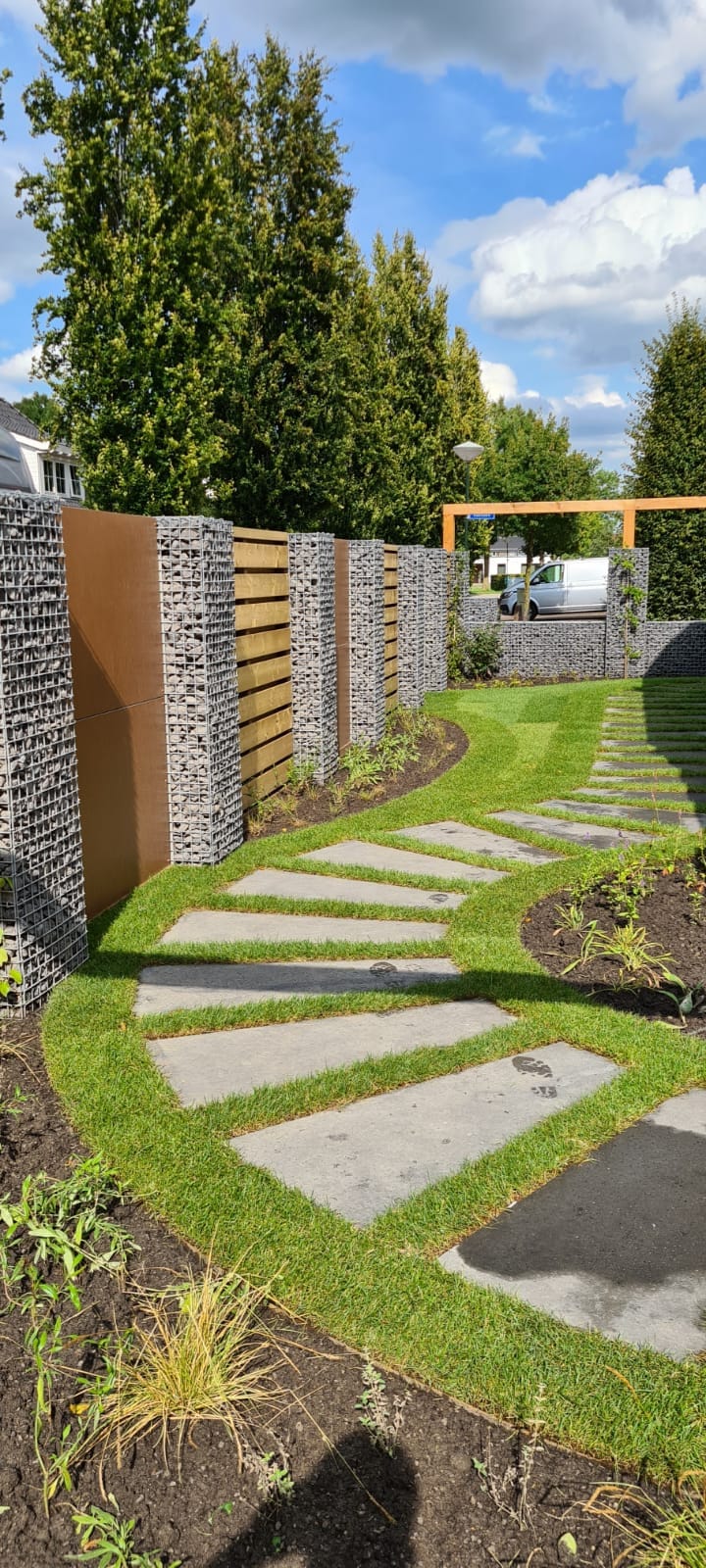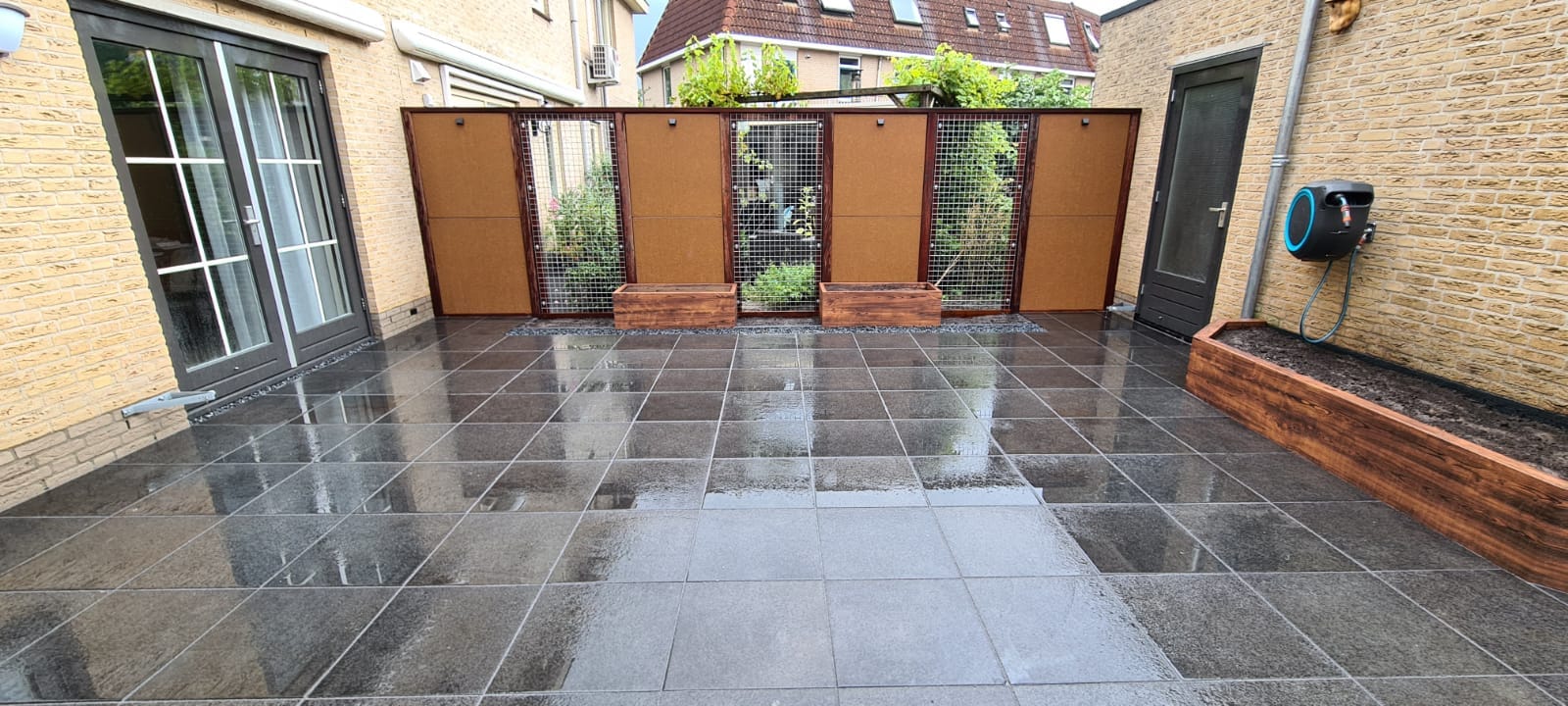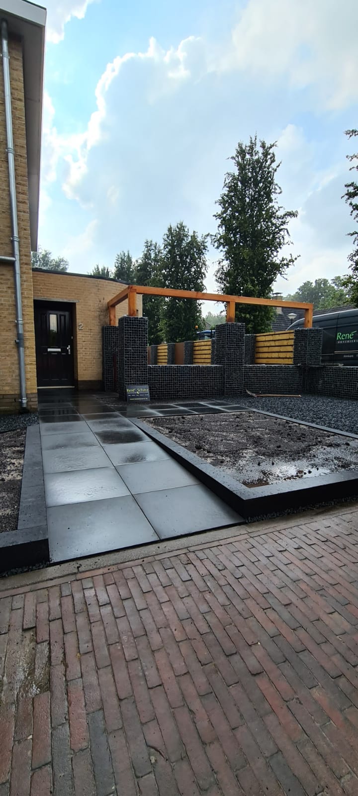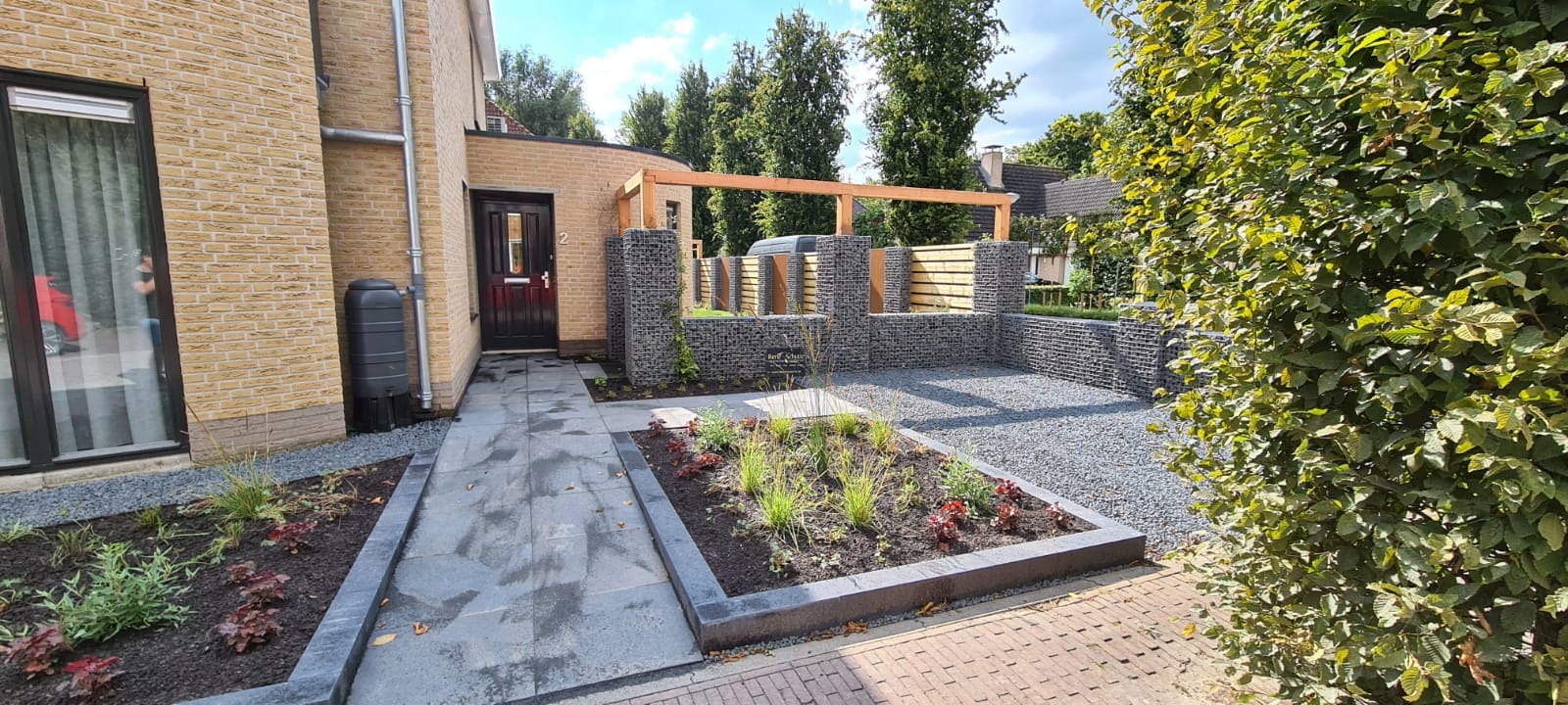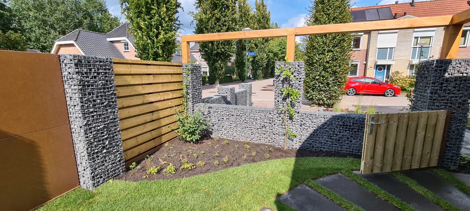 Voor in een tuin in Rijswijk (NB) mochten we weer gaan werken met Oudhollandse trapezium tegels. Dit keer was de wens voor een iets natuurlijkere tuin. Daarom hebben we hier gekozen om ronde vormen te gebruiken in combinatie met strakke lijnen. De zuilen van schanskorven, de cortenstalen panelen en de Douglas pergola vormen de strakke lijnen, de ronde borders en de trapezium tegels zorgen voor een verzachtend effect en geven een natuurlijk tintje aan de tuin. Qua beplanting wordt het koemende jaren een kleurexplosie. Diverse vaste planten, heesters, siergrassen en klimplanten gaan er voor zorgen dat het hier genieten wordt.