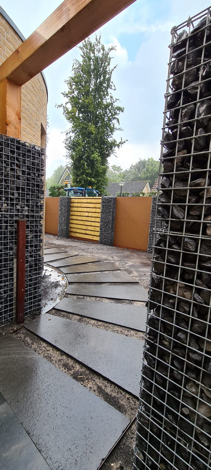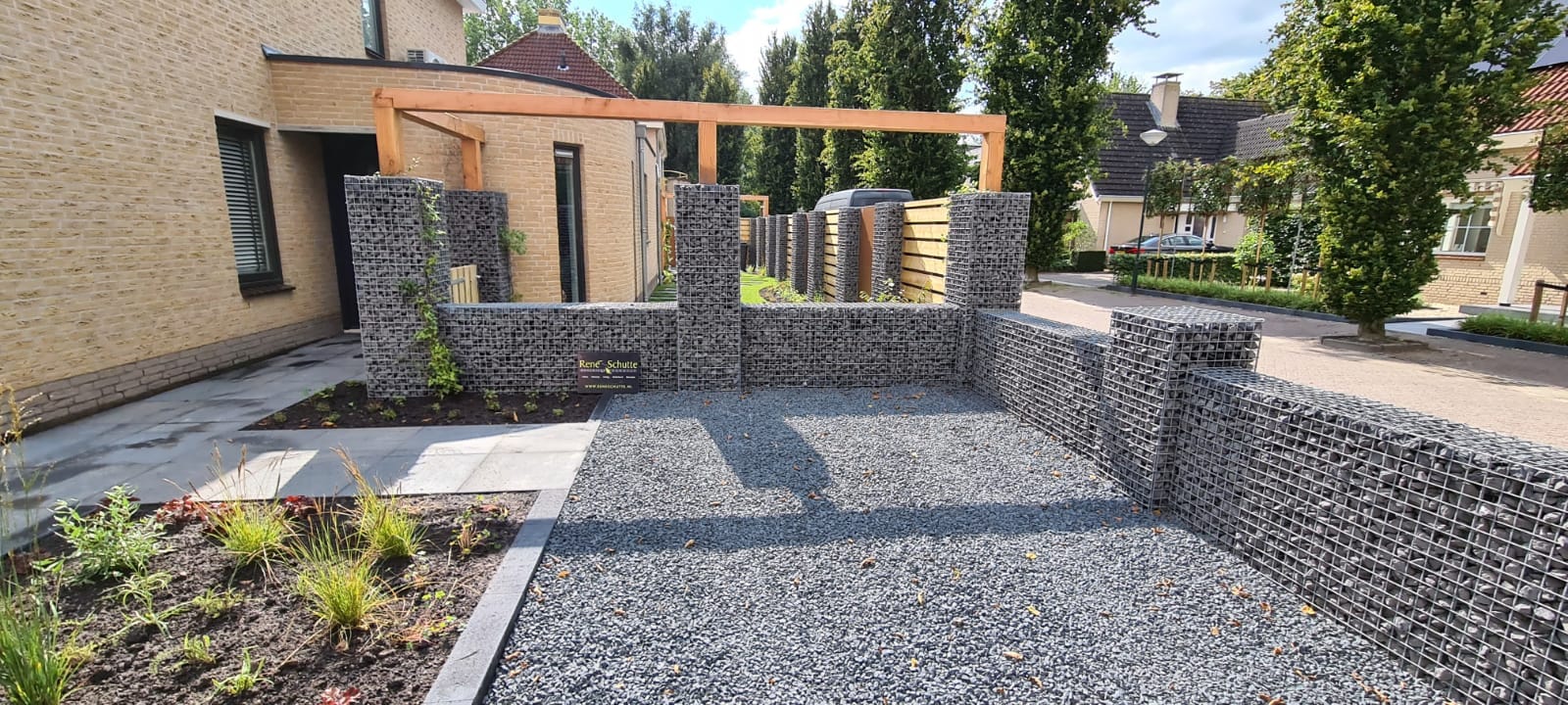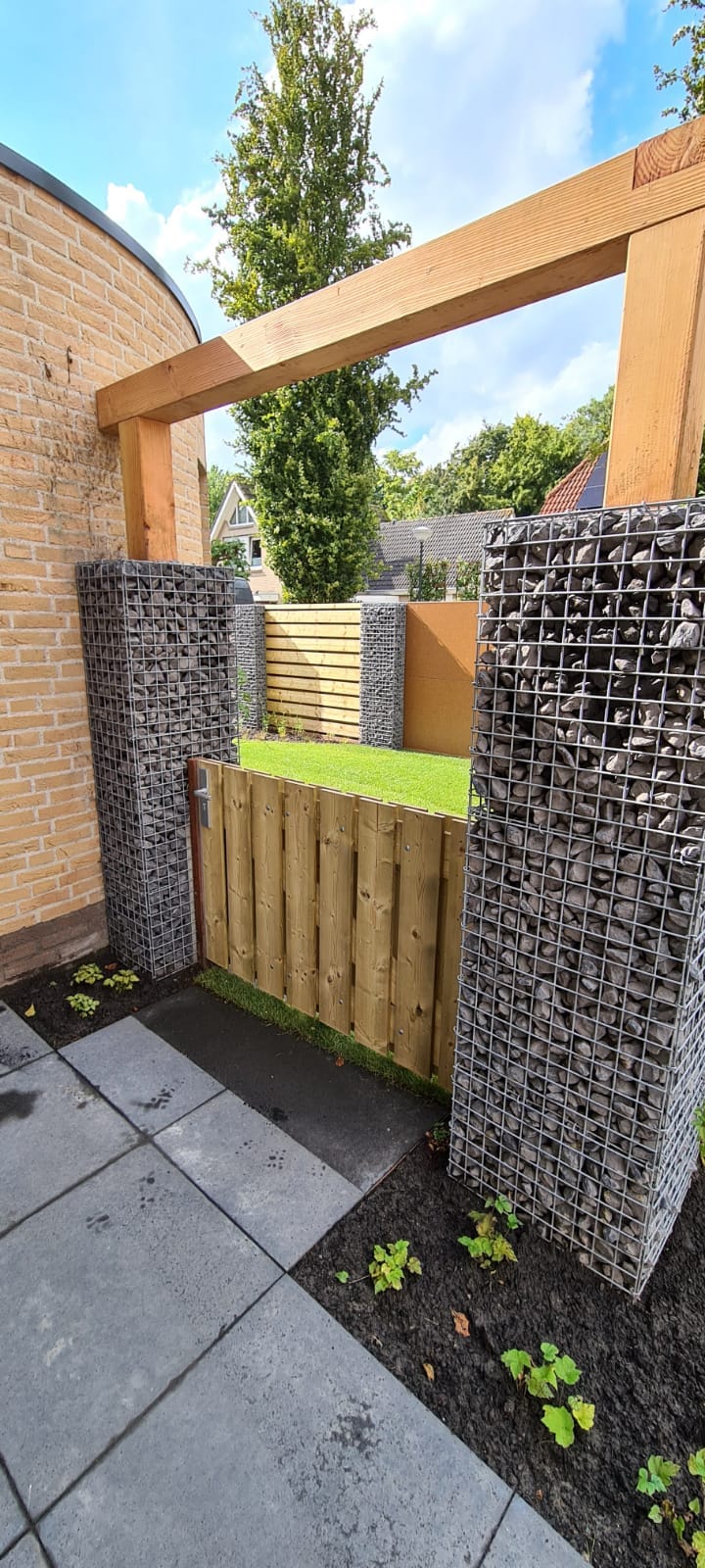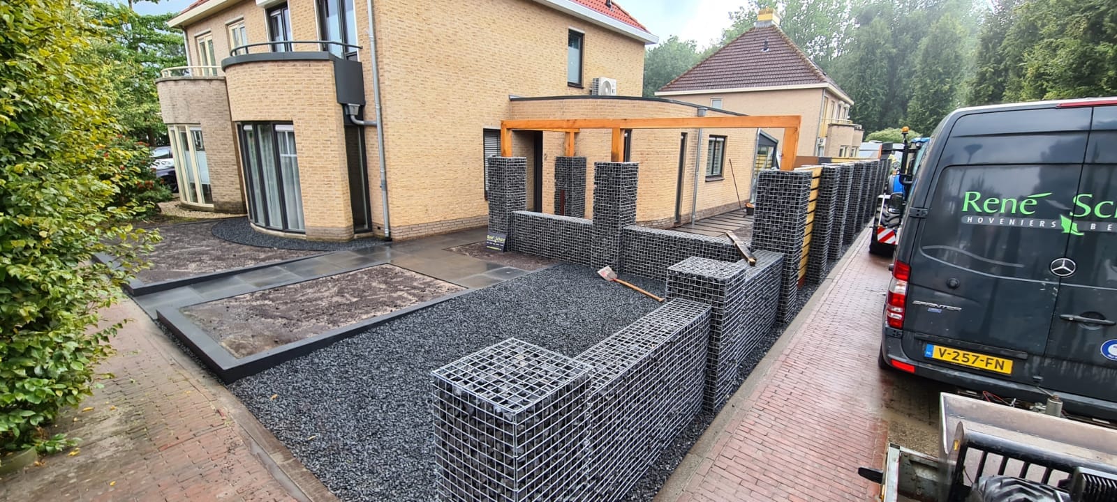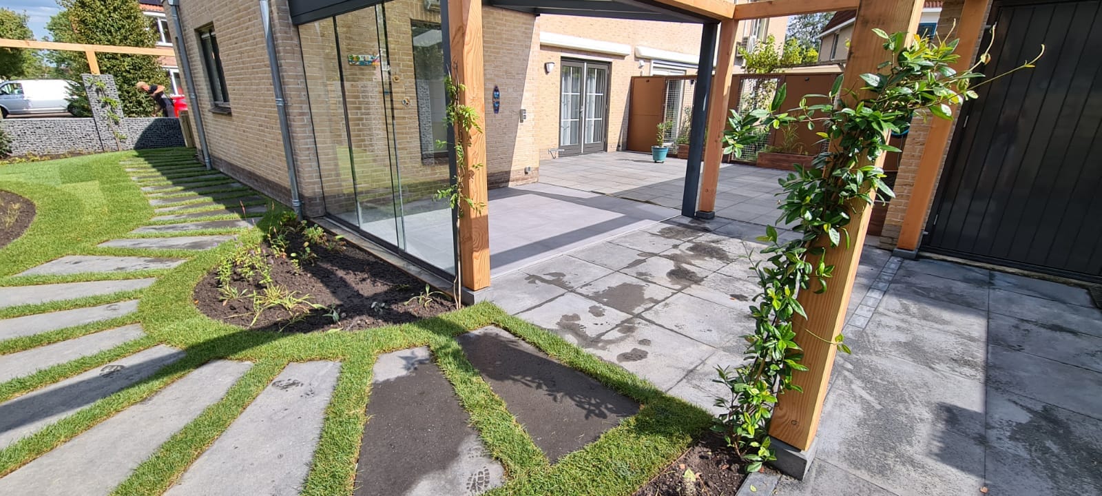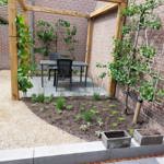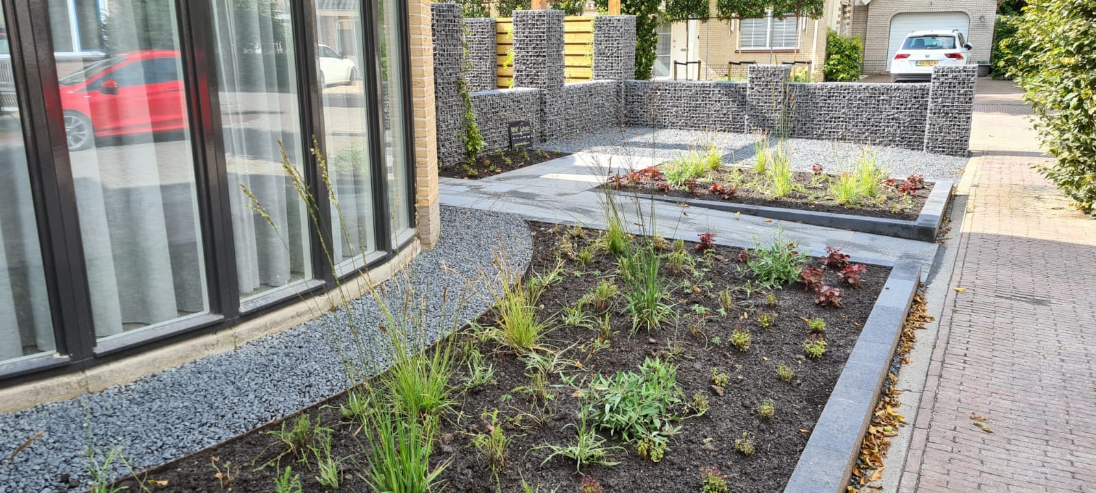 Voor in een tuin in Rijswijk (NB) mochten we weer gaan werken met Oudhollandse trapezium tegels. Dit keer was de wens voor een iets natuurlijkere tuin. Daarom hebben we hier gekozen om ronde vormen te gebruiken in combinatie met strakke lijnen. De zuilen van schanskorven, de cortenstalen panelen en de Douglas pergola vormen de strakke lijnen, de ronde borders en de trapezium tegels zorgen voor een verzachtend effect en geven een natuurlijk tintje aan de tuin. Qua beplanting wordt het koemende jaren een kleurexplosie. Diverse vaste planten, heesters, siergrassen en klimplanten gaan er voor zorgen dat het hier genieten wordt.