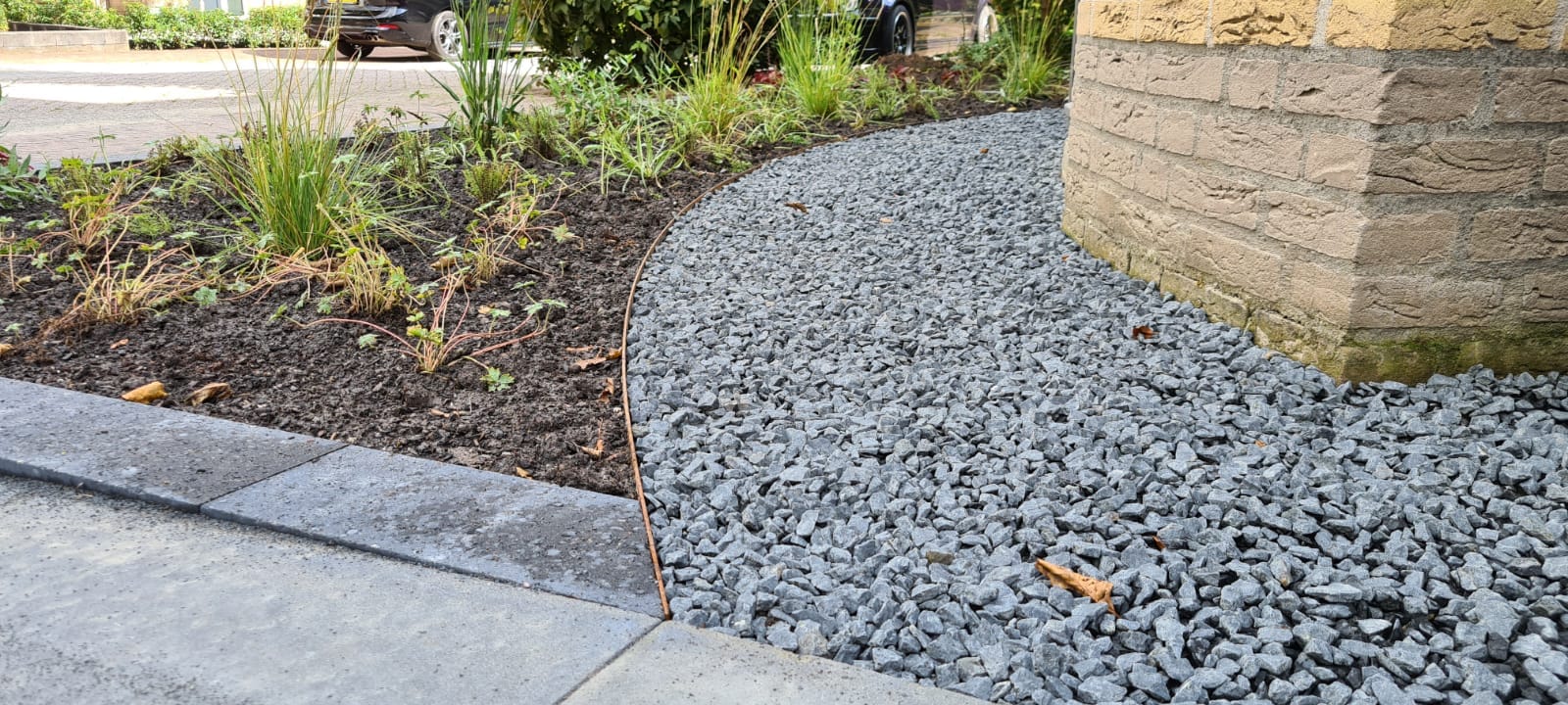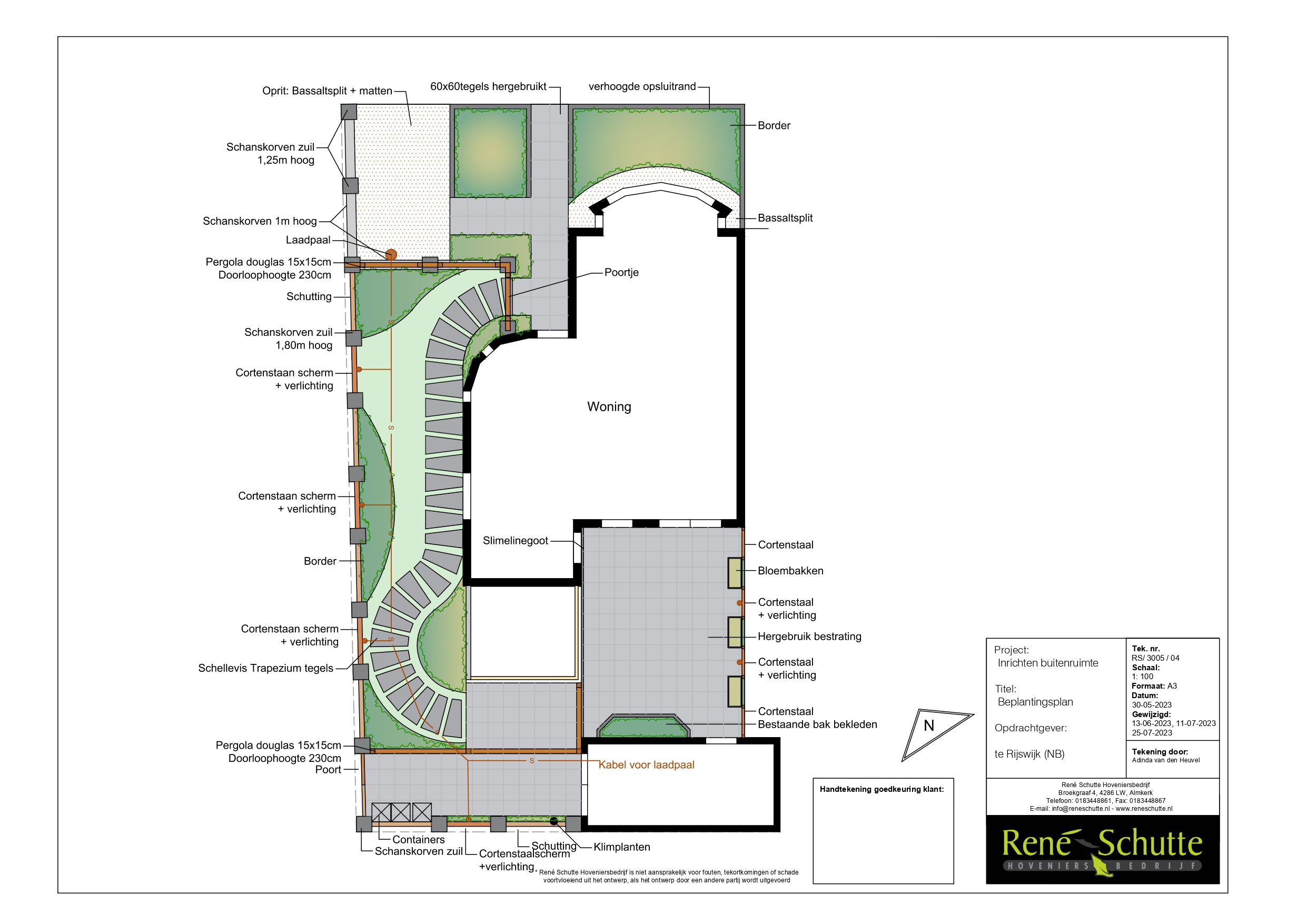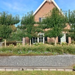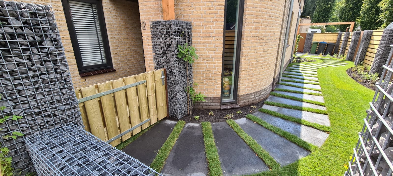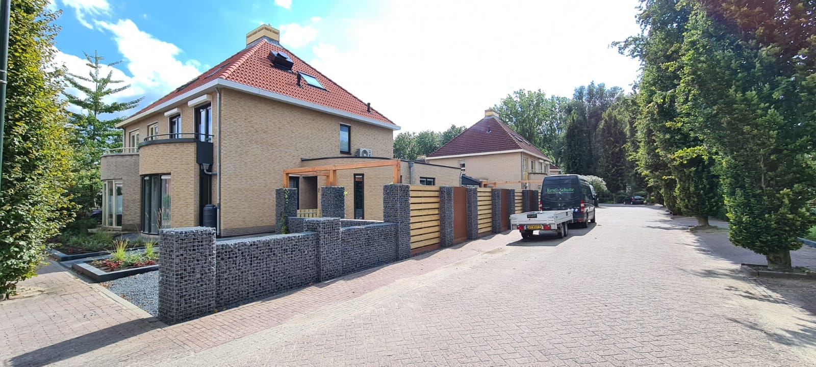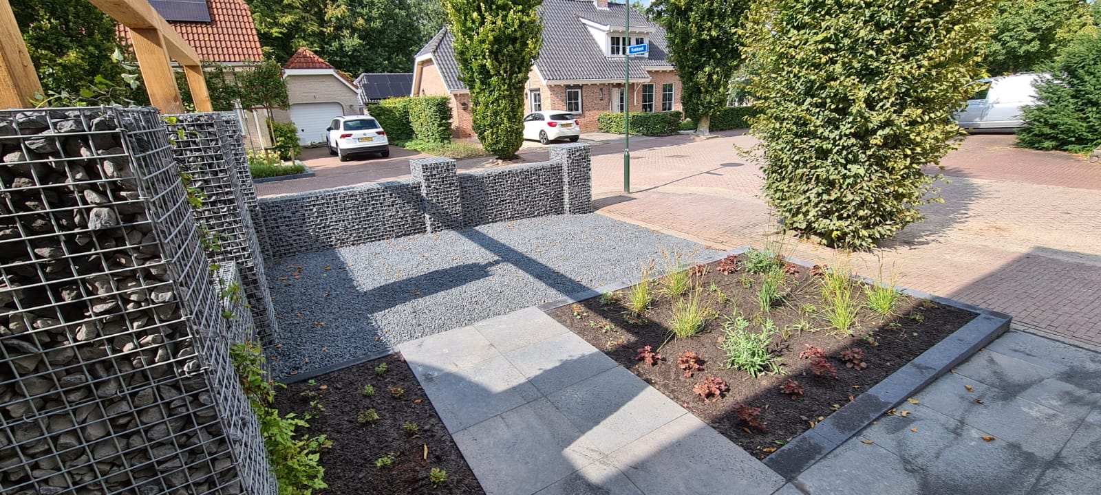Voor in een tuin in Rijswijk (NB) mochten we weer gaan werken met Oudhollandse trapezium tegels. Dit keer was de wens voor een iets natuurlijkere tuin. Daarom hebben we hier gekozen om ronde vormen te gebruiken in combinatie met strakke lijnen. De zuilen van schanskorven, de cortenstalen panelen en de Douglas pergola vormen de strakke lijnen, de ronde borders en de trapezium tegels zorgen voor een verzachtend effect en geven een natuurlijk tintje aan de tuin. Qua beplanting wordt het koemende jaren een kleurexplosie. Diverse vaste planten, heesters, siergrassen en klimplanten gaan er voor zorgen dat het hier genieten wordt.