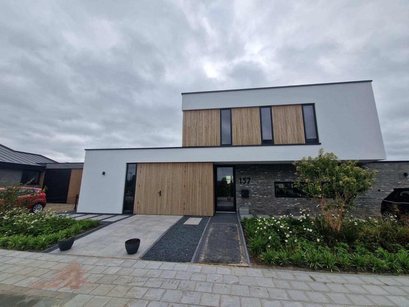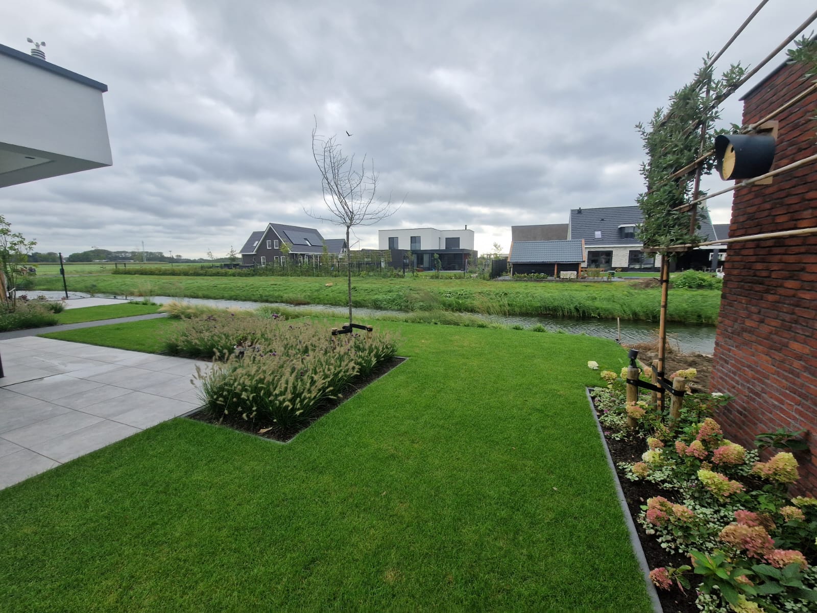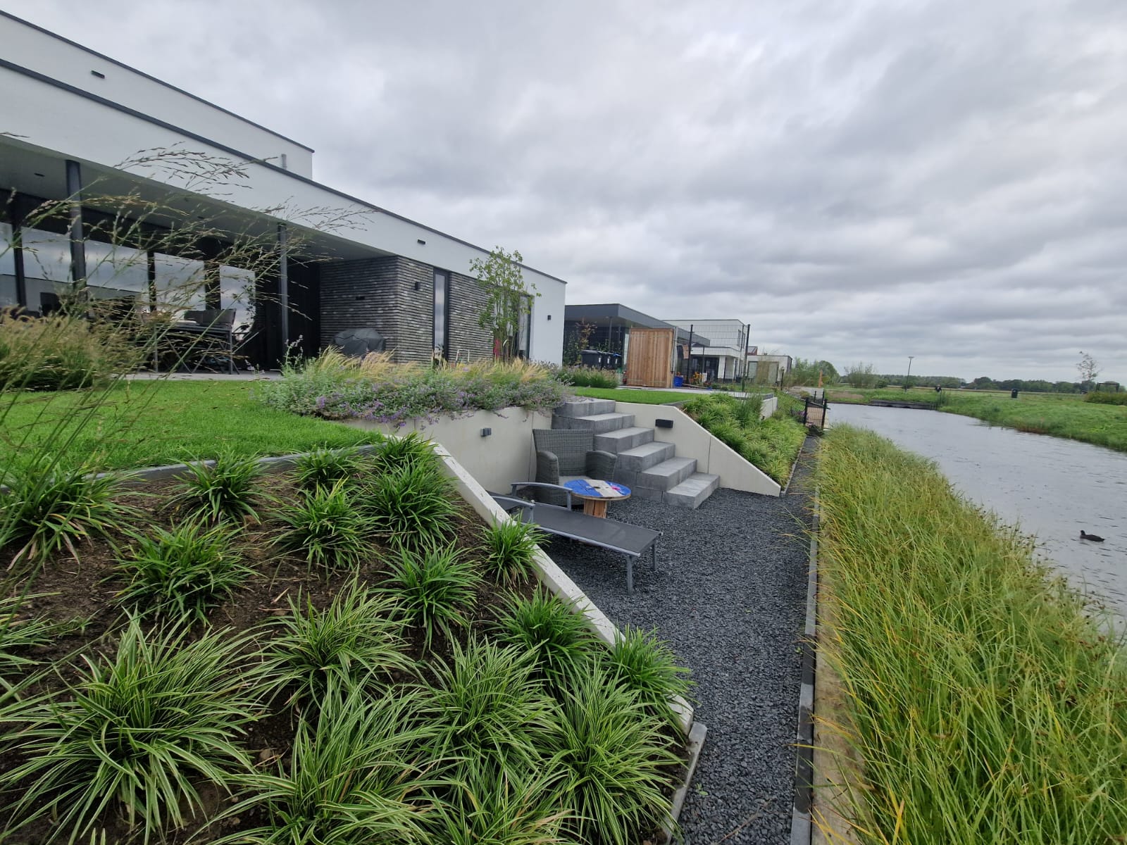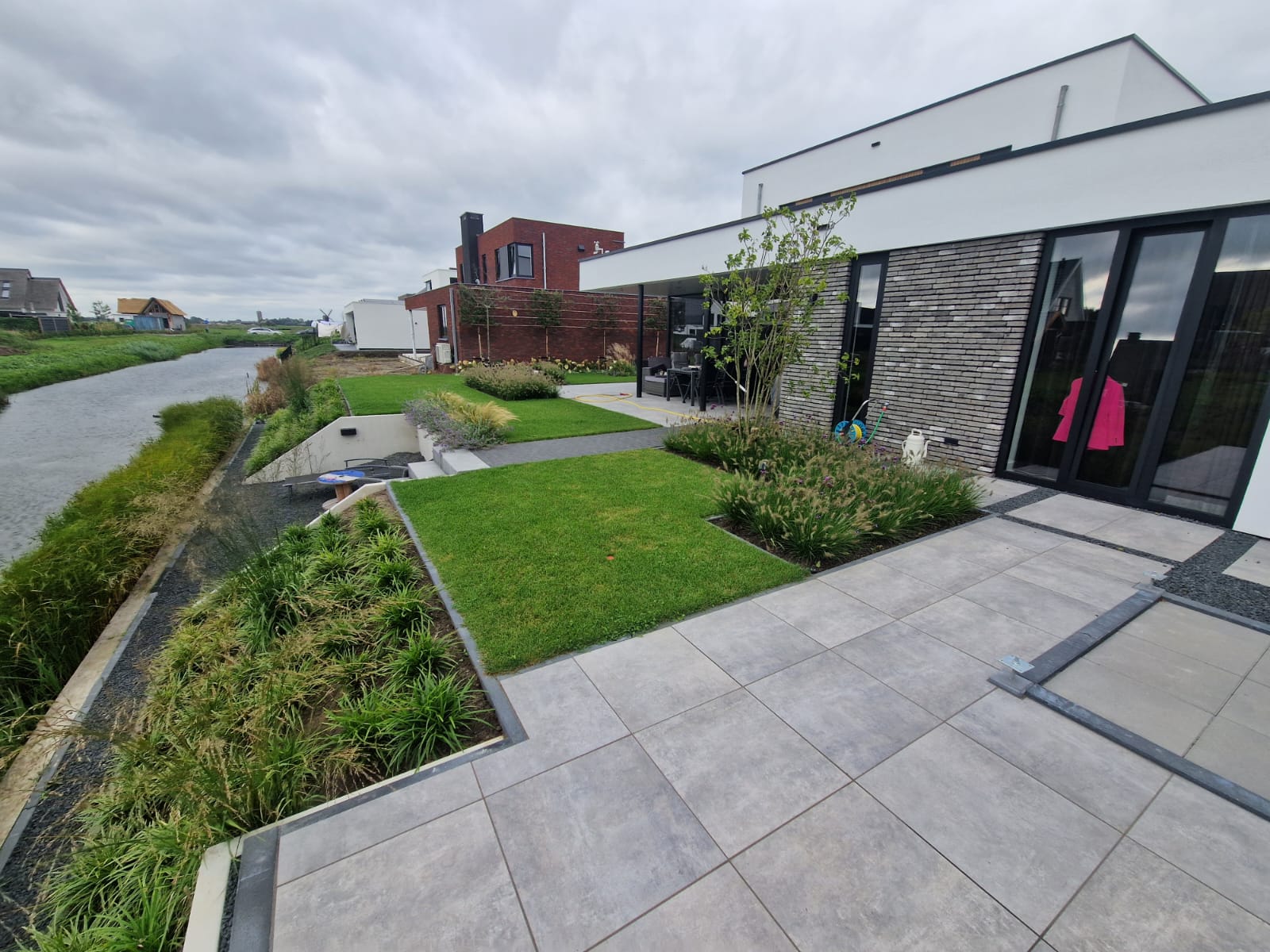 De bewoners van dit moderne huis in Sleeuwijk, wilde een strakke tuin met niet teveel onderhoud en een terrasje aan het water.